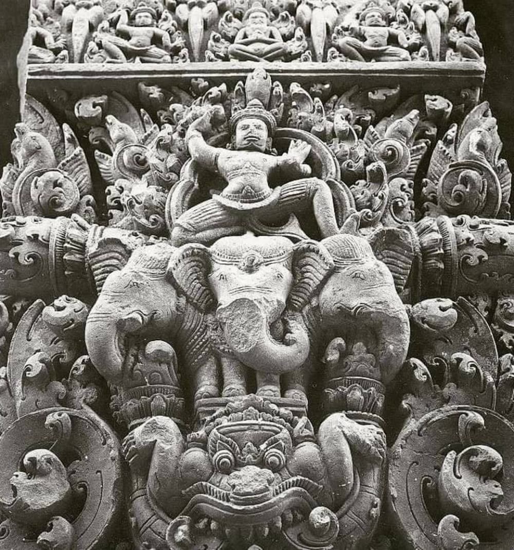 ចំណែក នៅប្រាសាទព្រះថ្កោល (នៅតំបន់ប្រាសាទបាកាណ) គេបានឆ្លាក់រូបដំរីក្បាលបីព្វវ៌តនៅតាមជ្រុងប្រាង្គកណ្តាលនៃប្រាសាទ ដែលនៅខាងលើមានរូបចម្លាក់គ្រុឌនៅពីលើ និងនៅពីលើគ្រុឌមានចម្លាក់សត្វហង្សតម្រៀបគ្នា។ ជានិមិត្តរូបបែបនេះ គឺគេចង់ភ្ជាប់សំណង់ប្រាសាទដែលឧទ្ទិសដល់ព្រះពុទ្ធសាសនាមហាយាននេះ កាន់តែមានអនុភាពខ្ពង់ខ្ពស់ឡើងដូចអំណាចសត្វអទិទេពនេះដែរ៕