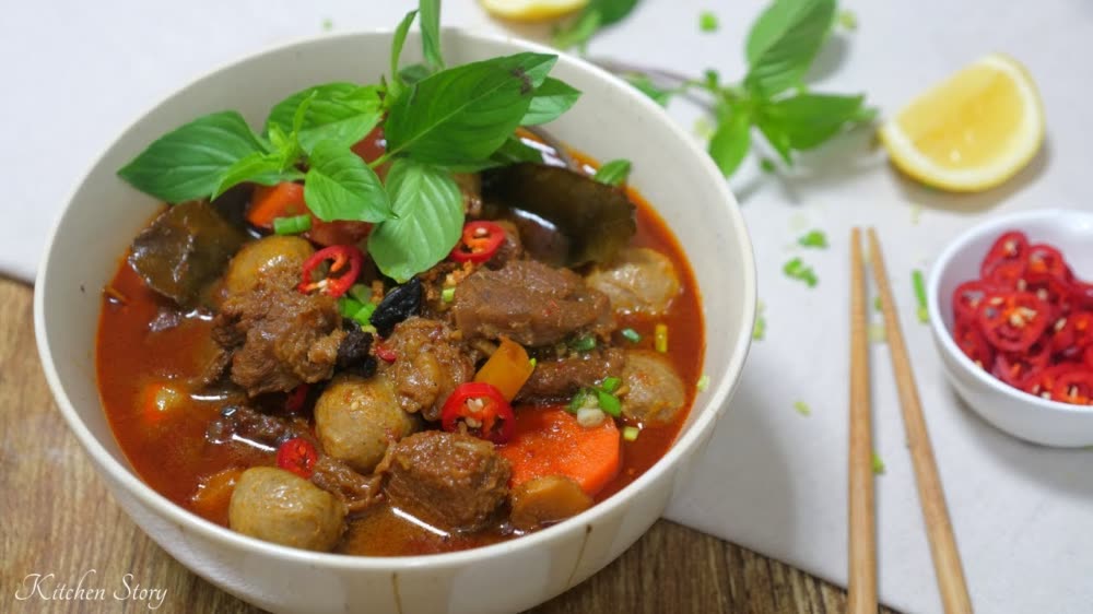 យកសាច់គោកាត់ជាដុំធំៗល្មម ប្រឡាក់អំបិល ទឹកត្រី ស្ករ ម្សៅស៊ុប ប៉េងប៉ោះកំប៉ុង ច្របល់អោយចូលគ្នា យកខ្ទះដាក់ខ្លាញ់បំពងខ្ទឹមសឲ្យឡើងឈ្ងុយ ទើបដាក់សាច់ឆាឱ្យក្រៀម កាប់ដូងពូជយកខ្ទិះចាក់រំងាស់ជាមួយសាច់ឱ្យផុយ ហើយលីងសណ្ដែកដីបកសំបកឱ្យស្អាត ដាក់ទាំងមូលរំងាស់ឲ្យឡើងខាប់ទឹក ទើបដាក់ចុះ រួចជាការស្រេច ។
