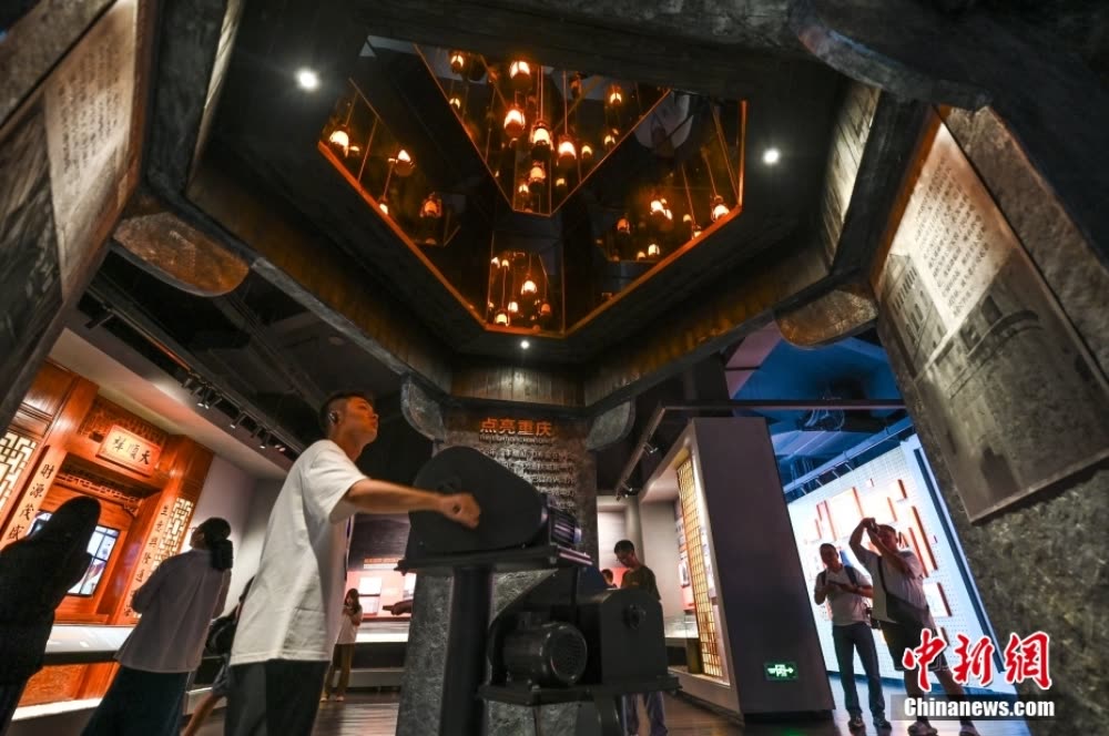市民在陈列馆体验手摇发电的方式,再现重庆第一盏电灯“点亮”场景