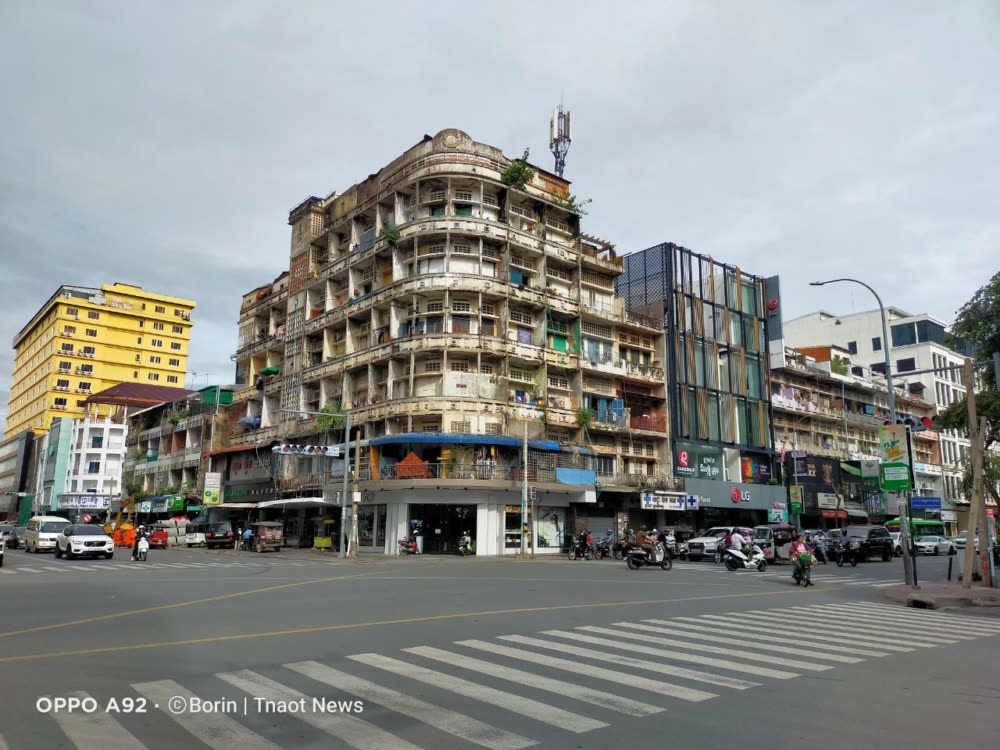 ព័ត៌មានរូបភាព |សំណង់អាគារចាស់ អង្គរជ័យ ដែលបានសាងសង់ក្នុងអំឡុងឆ្នាំ១៩៥០ ស្ថិតនៅកាច់ជ្រុងមហាវិថីព្រះមុនីវង្ស និងមហាវិថីកម្ពុជាក្រោម មានអាយុកាល ៧៤ឆ្នាំ មានសភាពទ្រុឌទ្រោមរងការបាក់បែកបំណែកថ្ម៕