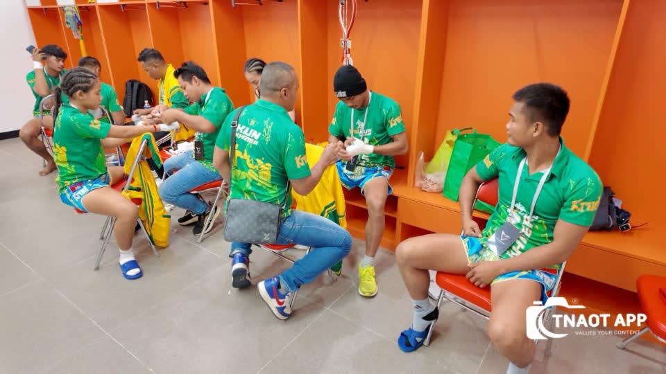 សកម្មភាពអ្នកលេងគុនខ្មែរជួរមុខកម្ពុជា កំពុងរុំដៃ និងរៀបចំខ្លួនត្រៀមឡើងប្រកួតជាមួយកីឡាករចិន នៅក្នុងព្រឹត្តការណ៍ ព្រឹត្តិការណ៍ សង្វៀង “Krud Kun Khmer To China 2