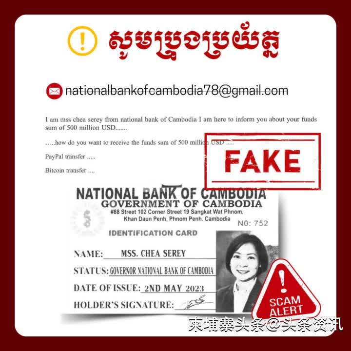 柬埔寨国家银行发出警示:谨防不法分子冒用央行名义行骗