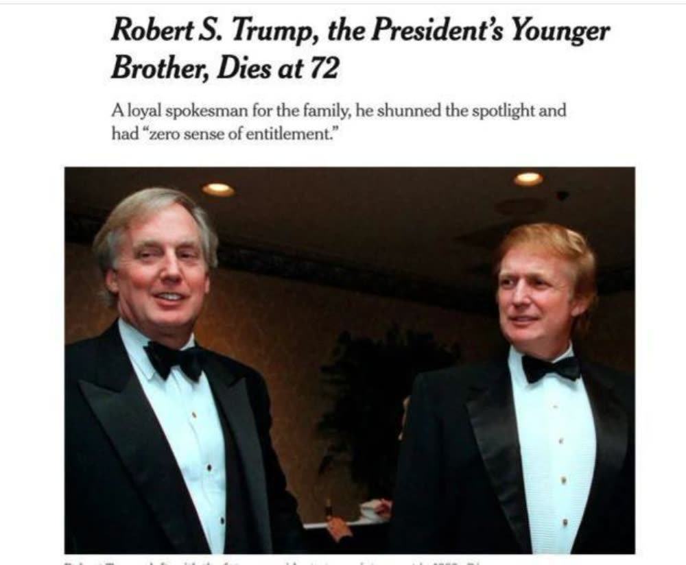 据美国媒体报道,美国现任总统唐纳德·特朗普的弟弟罗伯特·特朗普于当地时间周六晚在纽约曼哈顿的纽约长老会医院去世,享年72岁。白宫方面尚未公布罗伯特·特朗普去世的具体原因,而唐纳德·特朗普在周六深夜的一份声明中称,“他不仅是我的兄弟,还是我的挚友,人们会深深地怀念他,我们终将见面。”